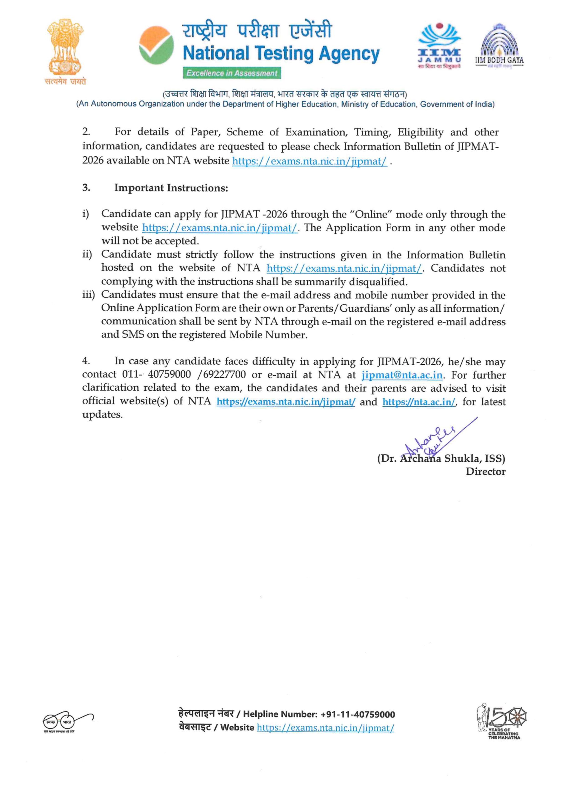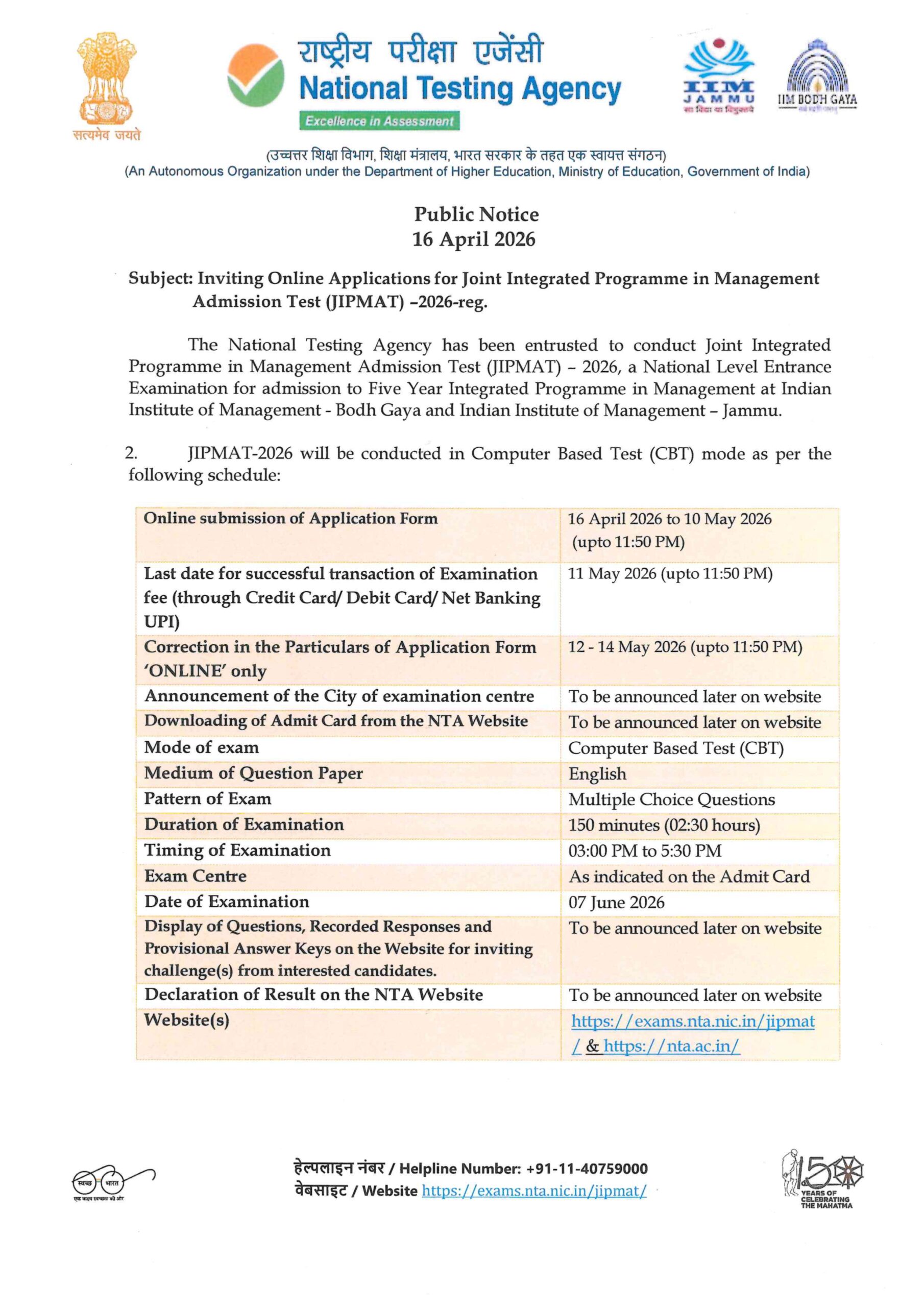Programme in Management Admission Test (JIPMAT) – 2026, a National Level Entrance